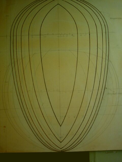 Photo 1 - the conventional catamaran hull and my MK 2 hull (faint outline) cross-sections.