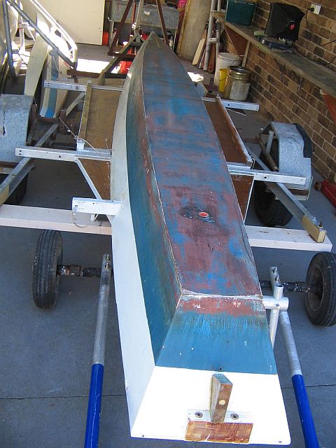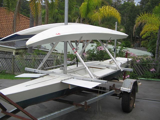I have constructed a trolley to carry the DORYTRI from its trailer across sandy beaches for off-beach launching. Essential for beaches that threaten to bog a car and boat trailer.P>