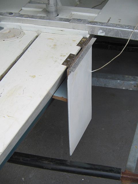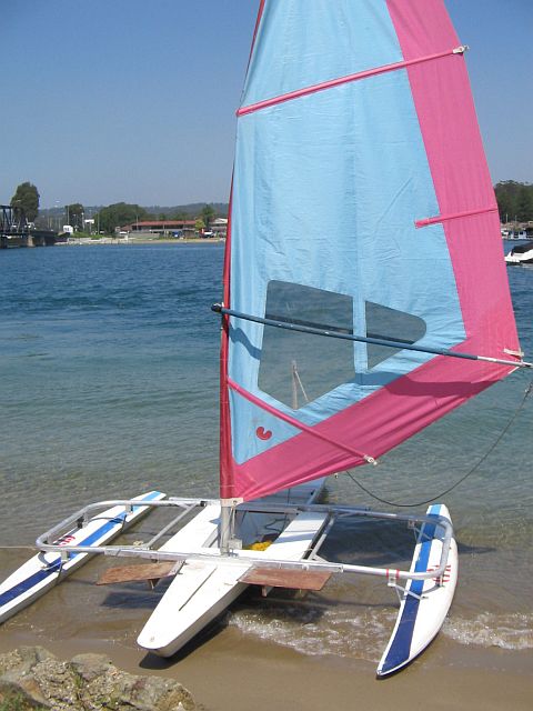 The hull of the DORYTRI was the centrehull of my WRC 6800 mm catamaran. It is a truncated-Dory as it has a transom stern instead of the chisel-shape stern of a Dory. The two outrigger hulls were produced from a Crit 370 fibreglass/foam sailboard by sawing along its fore-and aft-centreline. They are connected to the hull by cross-arm arrangements designed to facilitate investigation of the interaction between the outriggers and hull. Lateral resistance for the DORYTRI is provided by two leeboards which are shown in Photos 2-4 fastened in their up-position. For sailing they are dropped and are free to move in accordance with water forces, or positioned manually - as shown in Photo 5. The leeboards are attached to the hull to provide about 6 degrees angle-of-attack. My decision to use leeboards followed reading pages 52-53 of Joseph Norwood's book High Speed Sailing.