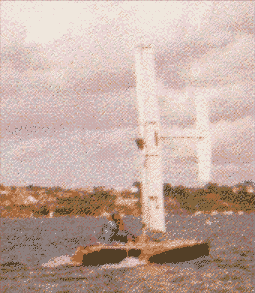 The sail is called "Skean-Dhu" (Patent No 9109807.9), and it controls an asymmetric underwater hydrofoil, to counteract the side force.