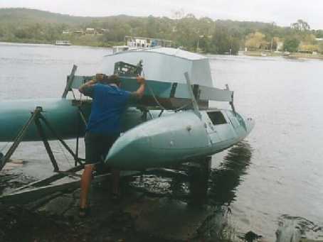 Photo 3 - the hulls are in a launching position - hanging freely from the bridgedeck and restrained from moving inwards.