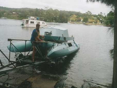 Photo 2 shows Windriggercat MK II rigged for trailering. Note the hulls are fixed in the trailering position.