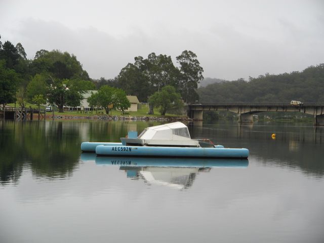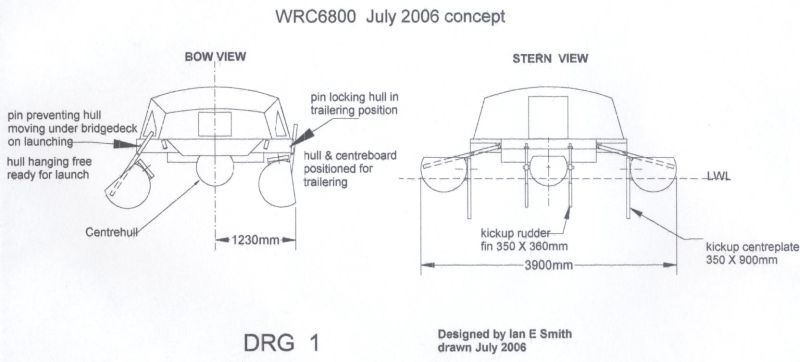 The last sailing trial on my WRC6800 catamaran was March 2006, when I broke its kickup rudder after being driven backwards by gusty winds into a muddy bank, whilst trying to retrieve my hat-overboard. This happening lead me to developing a rudder and centreboard which kicks-up in fore and aft directions - its concept is shown in DRG 1.