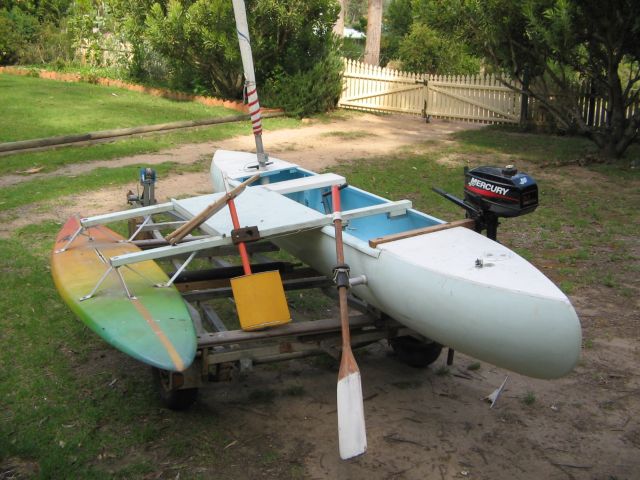 Referring to Photo 1, The outrigger is a wave-sailboard hull and the structure attaching it to the crossbeams is a quickfix which facilitates changing the board's planning angle and transverse tilt. Notable outcomes of the trials were - the proa was more manageable on the tack with the sailboard to leeward and it appeared to develop adequate lateral resistance - showing good potential for a trimaran using two sailboards thus negating the need for centreboard/fins. On the other tack the proa produced large weather-helm caused I guess by the centreplate positioned to far forward; and the steering oar was found to be very ungainly. Add to this scene, the threat of capsizing the proa in the unpredictable winds of the river and it is not surprising that these trials were non-productive. So I have mounted an outboard on the proa and aim to concentrate first on developing a functional rudder/steering paddle using outboard-motor power instead of sail-power. I favour the steering oar/paddle because it can be used to row the catamaran to assist tacking - and provide a means of propulsion when the outboard motor fails.
