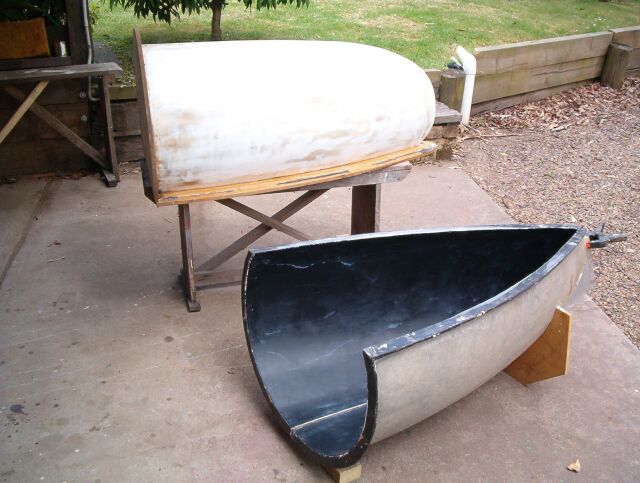 Photo 5 - showing the plug and mould for used to manufacture the GRP end-sections of the centrehull.