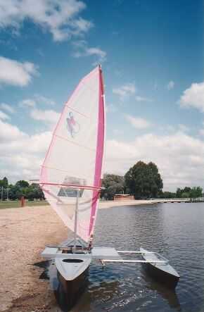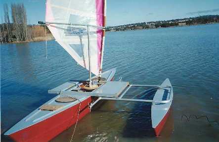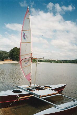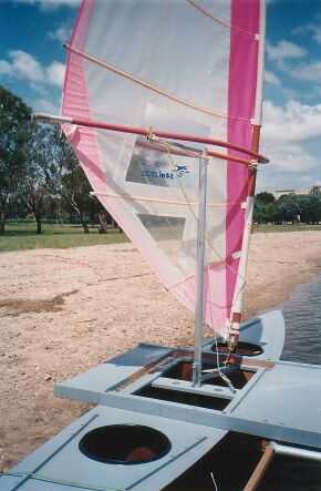 Photo 3 shows the sailrig set for sailing into the wind. Note a disc attached to the stubmast which was used to select and fix the angle of attack of the sail. Also note the absence of a mainsheet. A windward heading was maintained solely by shifting the crew-weight (me) fore or aft.
