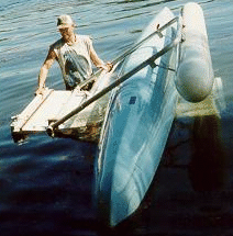 The following photos illustrate mechanical features of the capsize recovery arrangement incorporated in Windrigger MK 2 non-reversible proa. Mark Bennett is in the water.