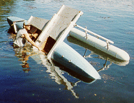 To solve the first problem, next capsize trial we shall attempt to remove the water by pulling the bag-bottom to deck-level when the hull is in a position between that shown in photos 2 and 3, preferably when the bridgedeck is vertical. I plan to reduce the suction by providing greater atmospheric-air access to the underside of the bag.