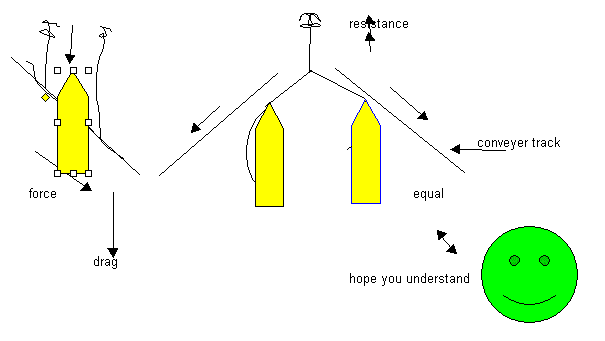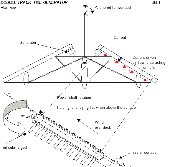 When water flows over the foils, the dynamic shape of the foils move the continuos line of foils down and across the flow in a diagonal direction collecting this never ending source of clean green energy. At the end of the bottom side of the conveyer track, the foils then turn the corner and twist into the horizontal position to travel back to the bow end. The horizontal position keeps the wind drag factor to the minimum. As the foils come out of the flow they are cleaned by the flow. Debris, seaweed plastic etc. are a major problem of extracting energy from this source and make other underwater turbines inefficient and difficult to clean and service.